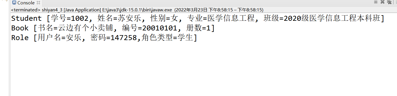 讯享网package lei; public class shiyan4_3 { public static void main(String[] args) { Student s1=new Student("1002","苏安乐","女","医学信息工程","2020级医学信息工程本科班"); Book b1=new Book("云边有个小卖铺","",1); Role r1=new Role("安乐","","学生"); System.out.println(s1); System.out.println(b1); System.out.println(r1); // s1.print(); } }