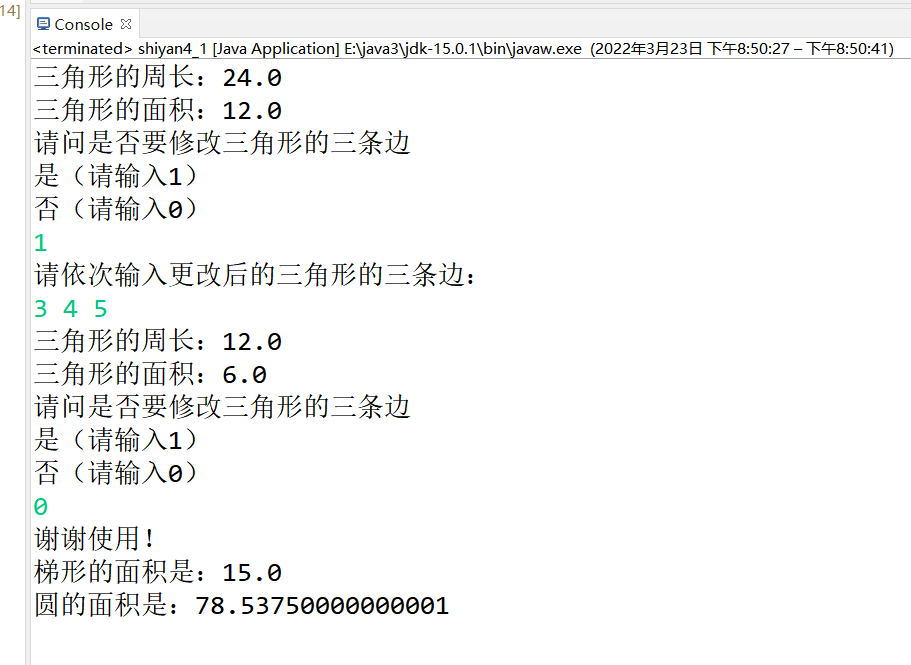 讯享网package lei; import java.util.Scanner; public class shiyan4_1 { public static void main(String[] args) { Triangle T1=new Triangle(6,8,10); Lader l1=new Lader(4,6,3); //上底 下底 高 Circle c1=new Circle(5); //半径 Scanner sc=new Scanner(System.in); System.out.println("三角形的周长:"+T1.getZhouChang()); System.out.println("三角形的面积:"+T1.getMianJi()); T1.Ask(); System.out.println("梯形的面积是:"+l1.getMianji2()); System.out.println("圆的面积是:"+c1.getMianJi3()); } }