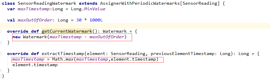 所谓WaterMark的乱序时间是30s,在代码中的体现为:waterMark = element.maxTimestamp - 30s,也就是当前获取到数据的最大时间戳减去允许乱序的时长