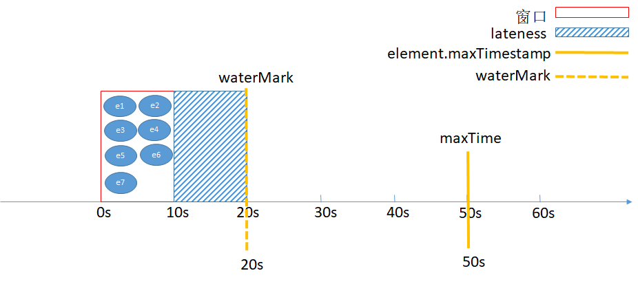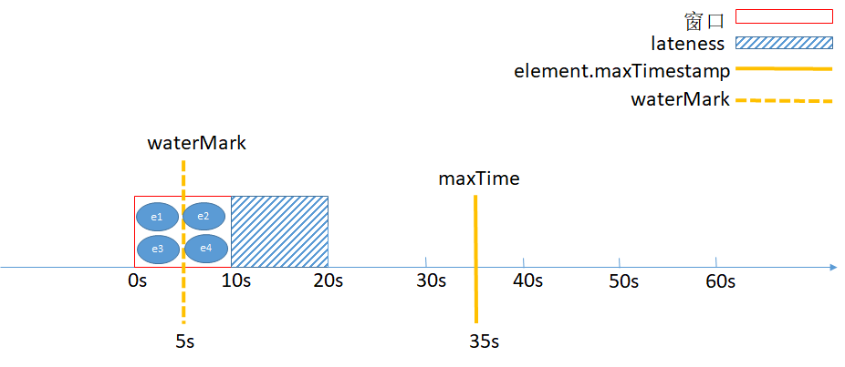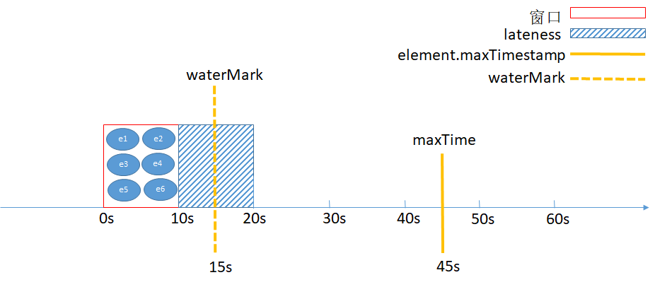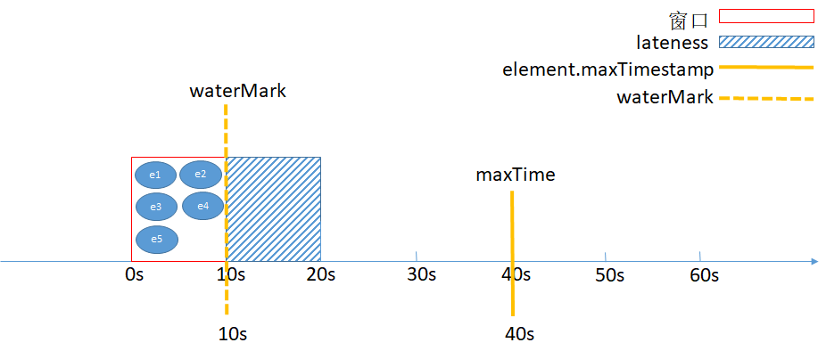 e、element.MaxTimestamp = 40s ; waterMark = 10s: