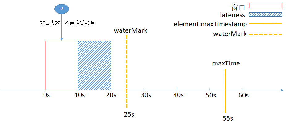 1、 如果此时过来一条时间戳属于窗口内的数据e8,此时waterMark <= window.MaxTime + lateness逻辑判断窗口是否失效,此时窗口已经失效,所以不再接受e8数据,e8数据会被丢弃