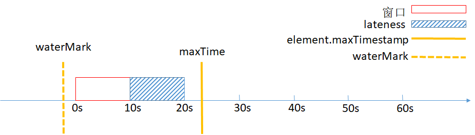 所以此时在系统内部有两个调用onEventTime的时间点:waterMark >= 10s(window.maxTime) 或者 waterMark >= 20s(window.maxTime(10s) + lateness(10s))