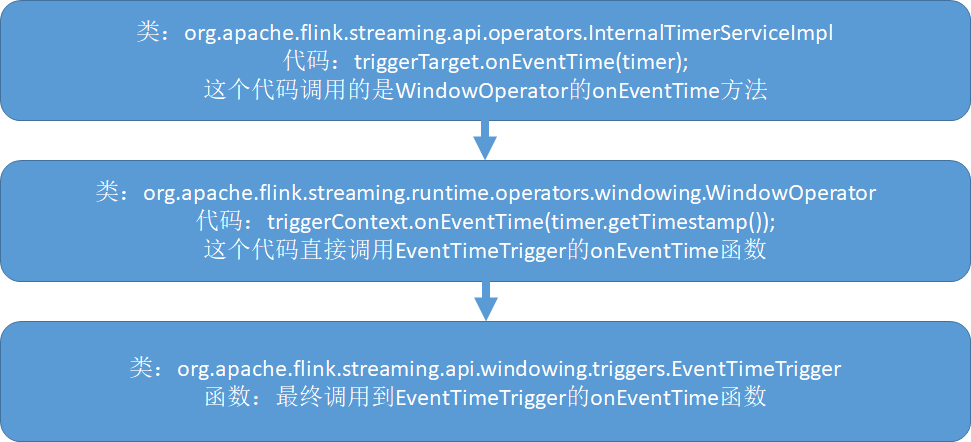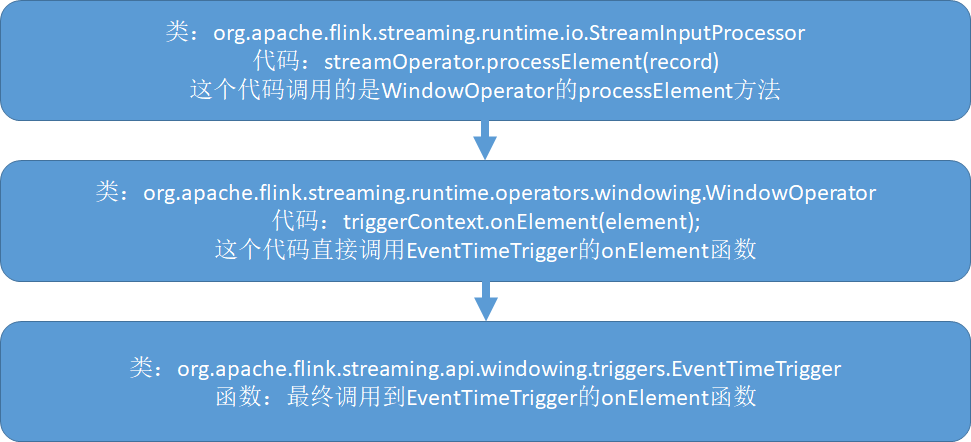 这里列一下EventTimeTrigger中两个函数上游的调用过程,除了Trigger之外,下面拆解的流程中,窗口的生成,数据的处理,数据的删除和触发器的触发等,都是在WindowOperator中。