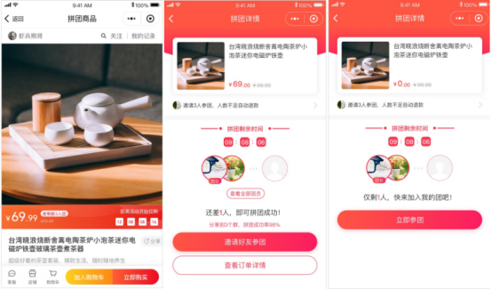 解析:这是整个拼团玩法里面,用户最多,覆盖面最广的玩法。这种玩法通常都是选择截止高、噱头大、话题及传播性强的产品作为拼团商品。
