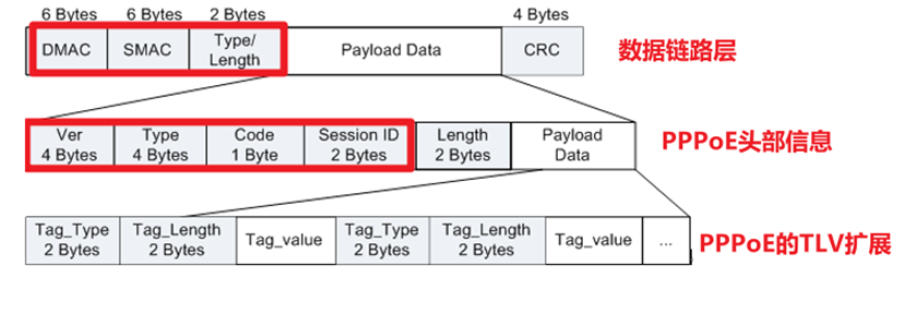 - Type/Length-----链路直接封装的协议(0X8863表示Discovery阶段,0X8864表示Session阶段)