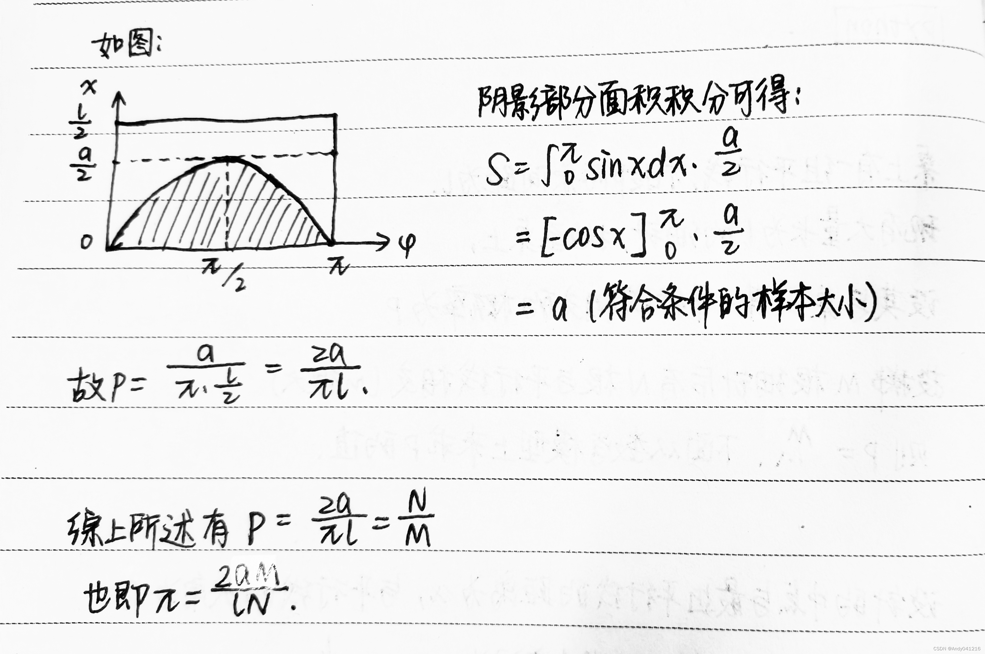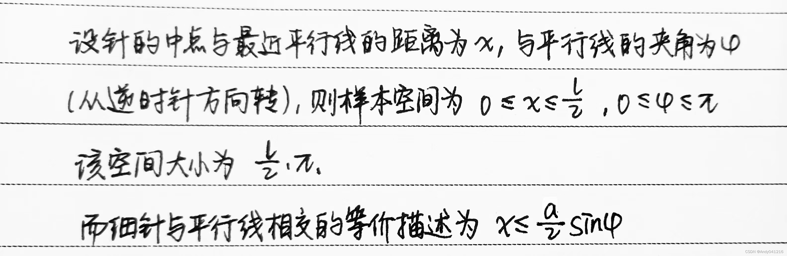 桌上有一组平行线,相邻两条间距为l,现有大量长为a(a<=l)的细针,抛掷于桌上。设其与桌上某一平行线相交的概率为P。进行实验,投掷M根细针后有N根与平行线相(M很大),于是可以用频率替代概率,即P=N/M。接下来从数学模型上分析P的值。