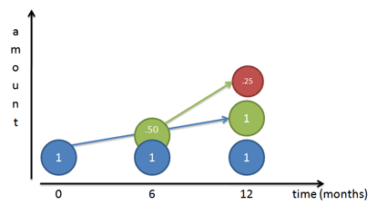 假设你在银行存了1元钱(下图蓝圆),很不幸同时又发生了严重的通货膨胀,银行存款利率达到了逆天的100%!