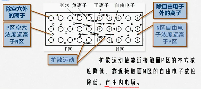 由于扩散运动使P区与N区的交界面缺少多数载流子,形成内电场,从而阻止扩散运动的进行。