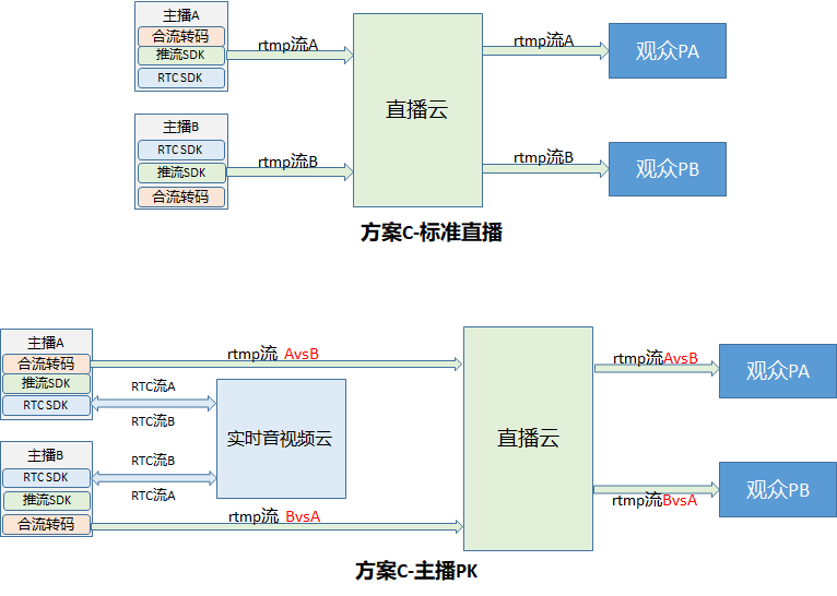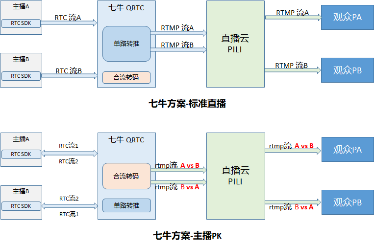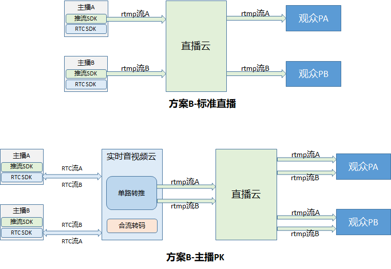 所谓双流,指的是观众端会拉两个主播的流,而非其他方案的一个流。除了双流以外,该方案还没有使用连麦服务中的合流转码功能。