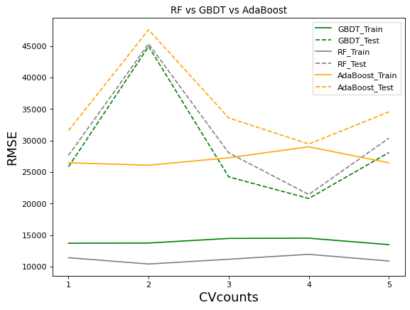 不难发现,AdaBoost是过拟合程度最轻的,这也反映出它没有调参空间的事实,而GBDT与随机森林过拟合程度差不多,不过GBDT的过拟合程度相对较轻一些,这是因为Boosting算法的原理决定了Boosting算法更加不容易过拟合。