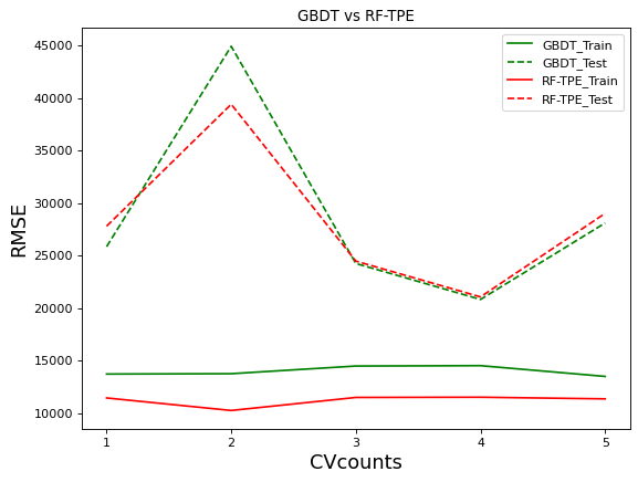 GBDT在默认参数上的结果接近经过TPE调参后的随机森林,我们来看看这两个算法的对比: