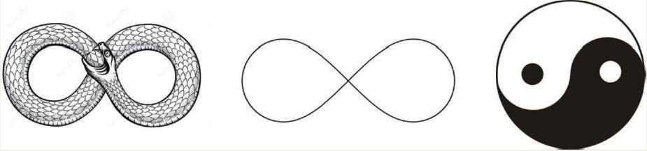 在数学中,无穷大的符号是个躺倒的8字,据传这个符号就是来自Ouroboros(衔尾蛇)的形象。我倒觉得,阴阳鱼的形象与其接近。0 生1,无中生有;1 生2,两个个体之间的interaction 是本源。2 生万物。3,就是多。包含3 以至无穷个个体的物理体系,描述其行为只用interaction,pair potential,2足矣。