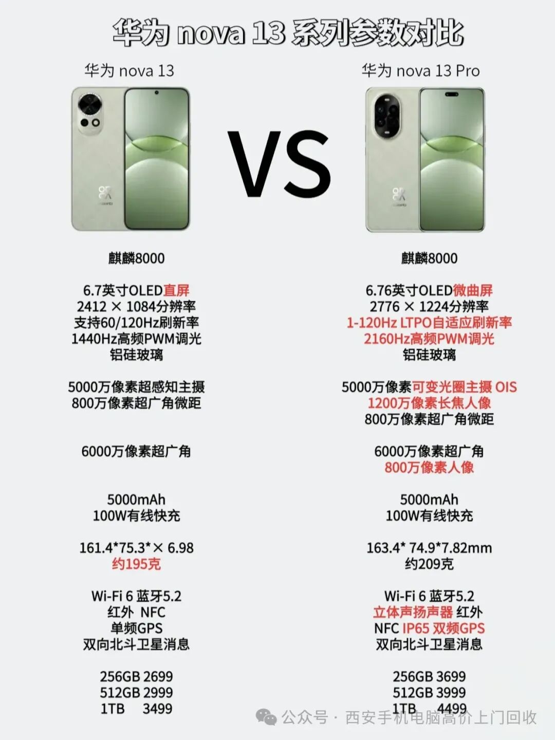 华为Nova13 Pro:相比标准版,配备了质量更好的屏幕,影像配置更强悍,还支持立体双扬声器、IP65防水防尘以及双频GPS
