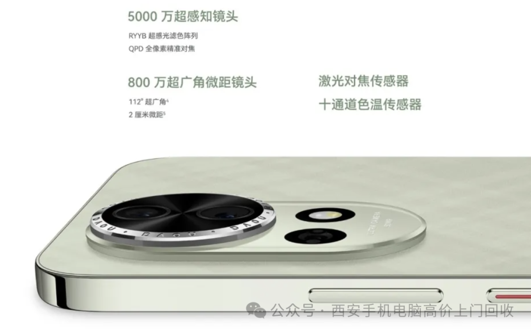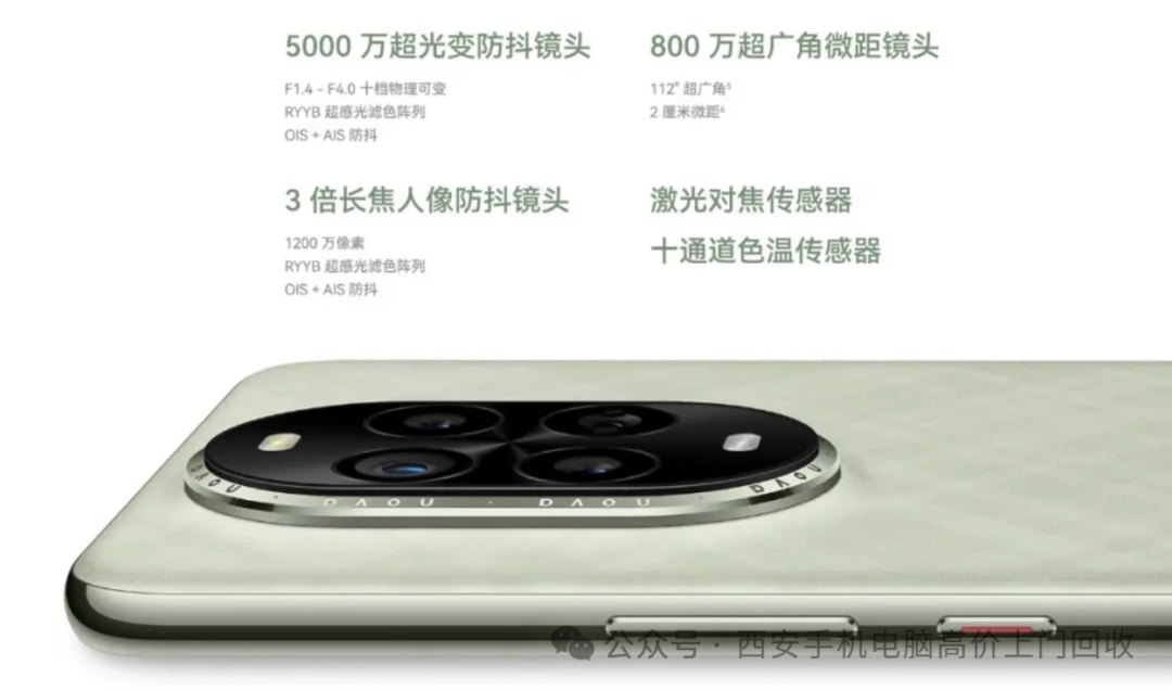 该机首次搭载双 RYYB + 双 OIS 5000 万多焦段人像三摄,包括 50MP 超光变防抖镜头、3x 人像长焦镜头、2cm 微距超广角镜头,前置 60MP 超广角追焦镜头+5x 变焦人像镜头,支持 AI 修图、AI 扩图、AI 消除等功能。