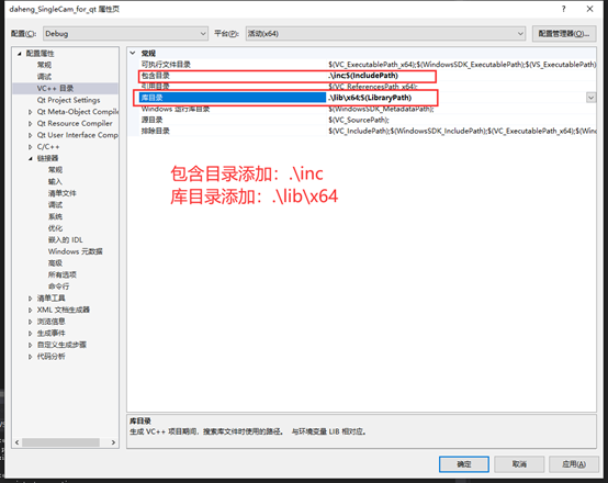 因为需要使用大恒官方的API,那么就需要使用官方提供的库文件和头文件。可以通过该步骤添加到项目中。(方法不唯一,这里为了移植到其他电脑才这样做的)