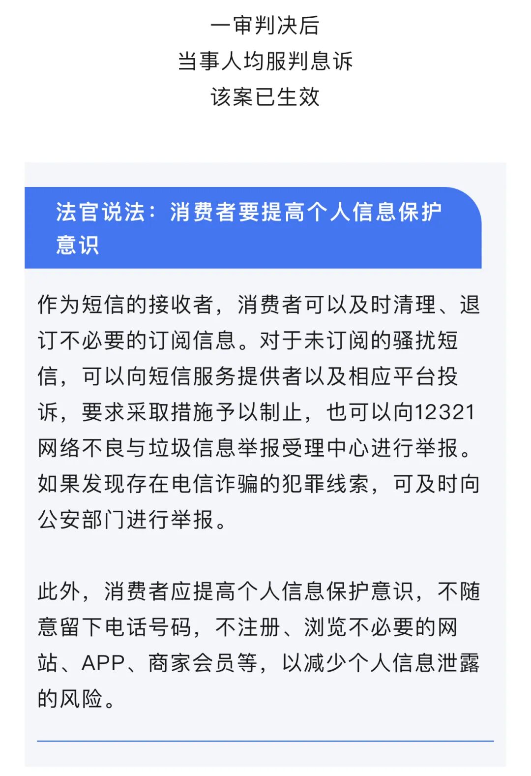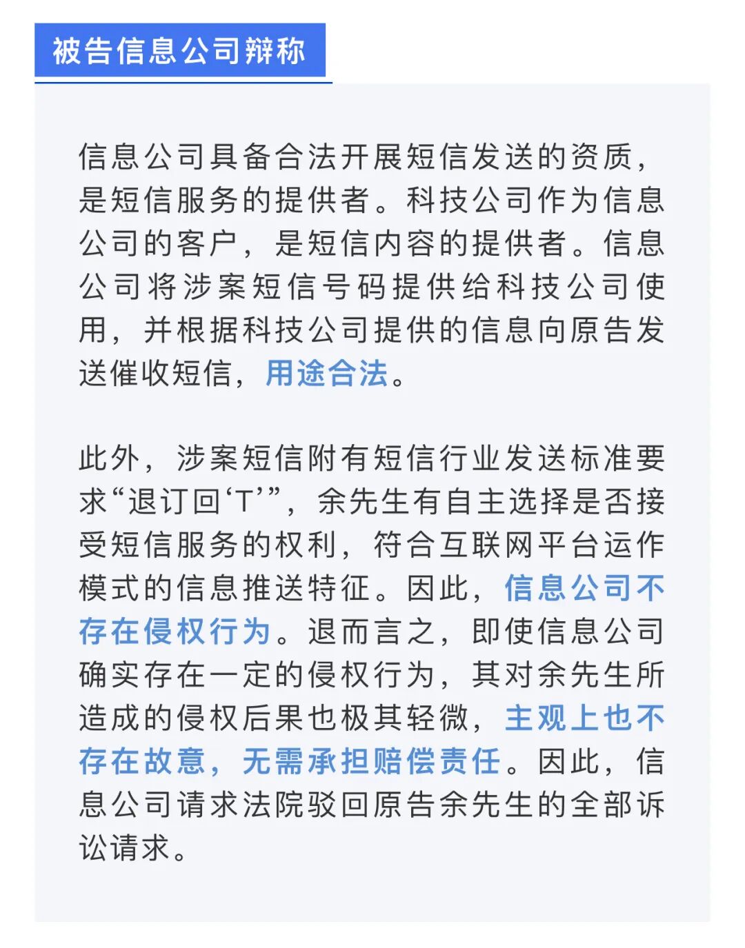 随后,余先生在网站上查询到短信号码的持有人为某信息公司。经向该信息公司查询,余先生发现该条短信的发送内容来源于某科技公司。