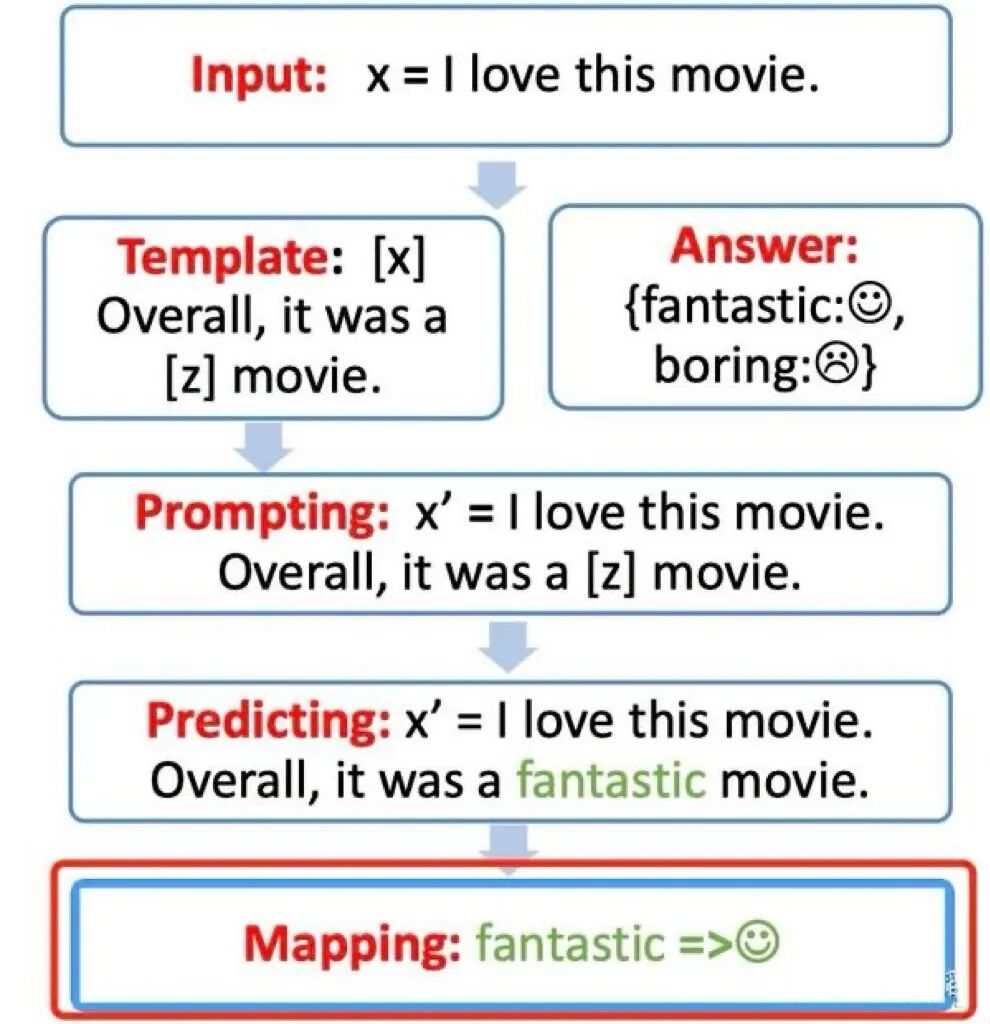 图2是以情感分类作为例子,阐述上述Prompt learning的步骤: