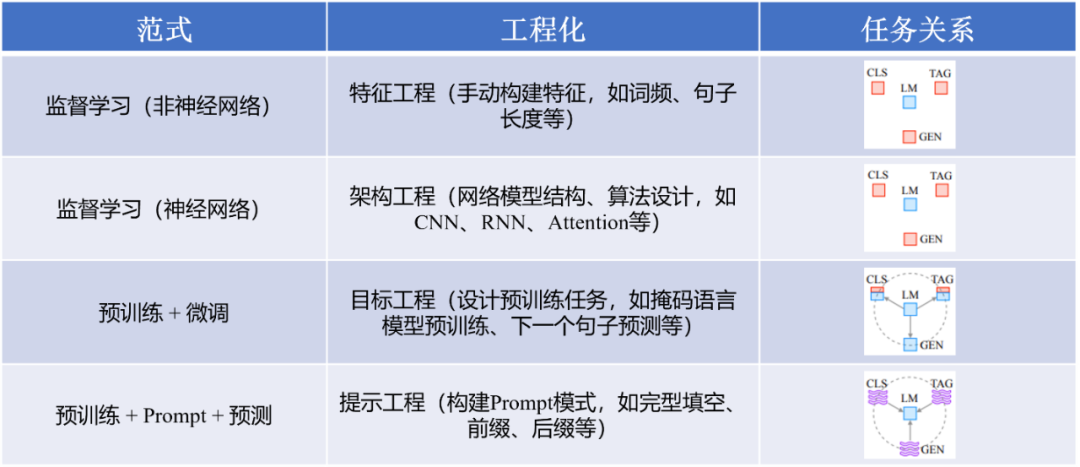 近年来,预训练语言模型已然成为自然语言处理(NLP)领域中备受瞩目的技术之一(典型NLP技术范式见图1)。预训练模型可以在大规模文本语料上进行自监督学习,从而获得丰富的语言学知识,并通过在下游任务上进行微调,实现出色的性能。提示学习(Prompt learning)则是一种最新的预训练模型范式,通过在预训练过程中提供特定任务的提示信息,来指导模型学习,帮助模型更好地利用任务的上下文信息,从而提高模型的性能。