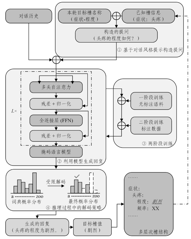 Prompt Learning的应用广泛,包括但不限于自然语言处理任务、计算机视觉、多模态、生物医学等领域。在医学领域,Prompt Learning的应用是一个新兴的研究方向,它可以利用预训练语言模型通过少量示例快速适应医学专业任务。例如在针对面向诊断的医疗对话系统无法支持精准医疗所需的信息粒度、难以同时满足医疗领域中多样化的槽值表示形式的缺陷,研究中提出了一种基于提示学习的多层次生成式医疗对话理解方法,即用多层次槽结构替代当前对话理解任务中单层的槽结构,以表示更细粒度的信息,之后采用一种基于对话风格提示的生成式方法,利用提示字符模拟医患对话,从多轮交互中获得多层次信息;提出在推理过程中使用一种受限的解码策略,使模型能够以统一的方式处理意图识别与分类型和抽取型的槽填充任务,避免复杂的建模;此外,针对医疗领域缺少标注数据的问题,提出了一种两阶段训练策略,以充分利用大规模的无标注医疗对话语料来提升性能。实验架构图见图3。最终实验结果表明,所提方法能够有效解析医疗对话中的各种复杂实体,相比已有的生成方法,其性能高出2.18%,而在小样本的场景下两阶段训练最高能提高模型5.23%的性能。