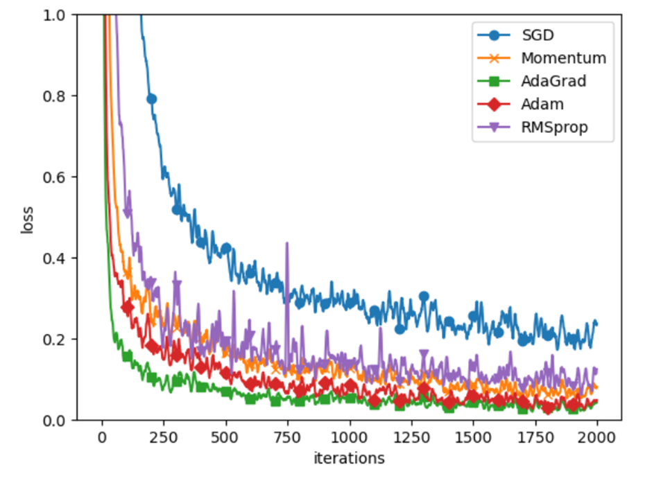- 每隔100次迭代,打印出各个优化算法的损失。
