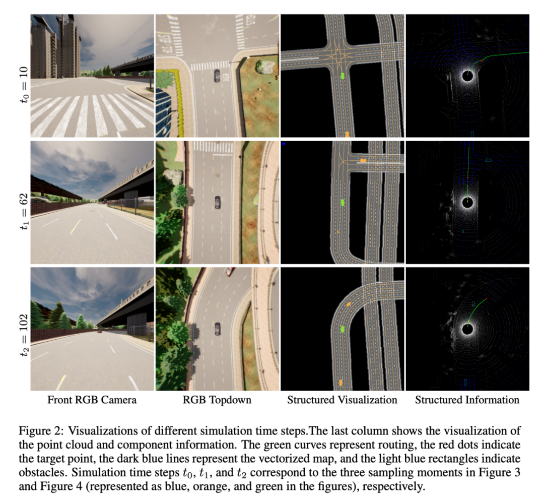 图2:不同仿真时间步的可视化。最后一列显示了点云和组件信息的可视化。绿色曲线代表路径规划,红色点表示目标点,深蓝色线条代表矢量化地图,浅蓝色矩形表示障碍物。仿真时间步t0t0、t1t1和t2t2分别对应于图3和图4中的三个采样时刻(在图中分别表示为蓝色、橙色和绿色)