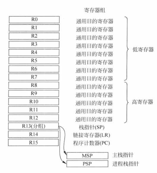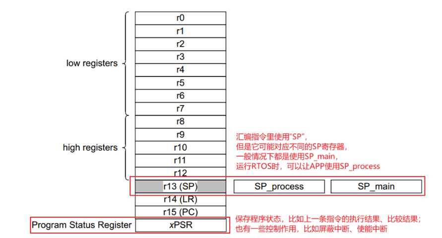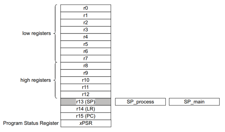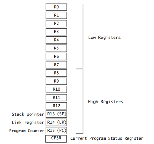 - 寄存器R0–R12为通用目的寄存器,前8个(RO–R7)也被称作低寄存器。由于指令中可用的空间有限,许多16位指令只能访问低寄存器。高寄存器(R8–R12)则可以用于32位指令和几个16位指令,如MOV(move)。RO–R12的初始值是未定义的。
