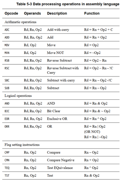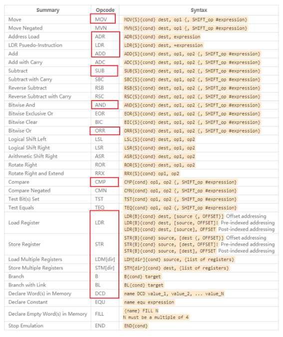 - Rn、Operand2是两个源操作数 Operation表示各类汇编指令,比如ADD、MOV;如下图: