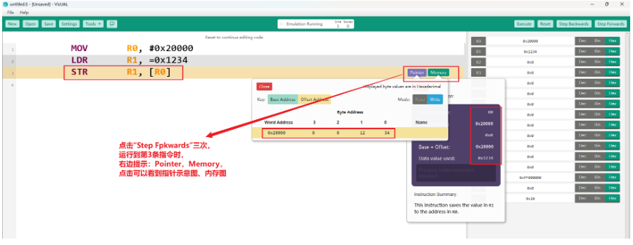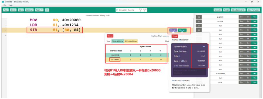修改上述汇编代码,让R1保存在R0+4的位置,并查看指针示意图和内存图: