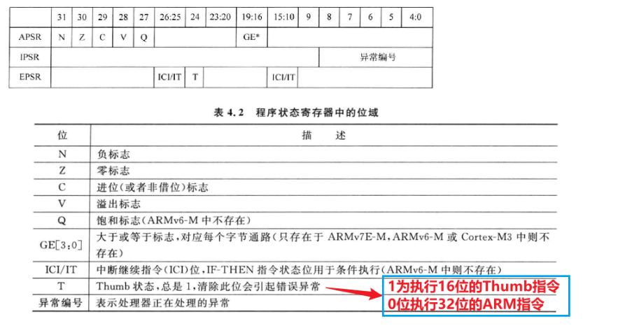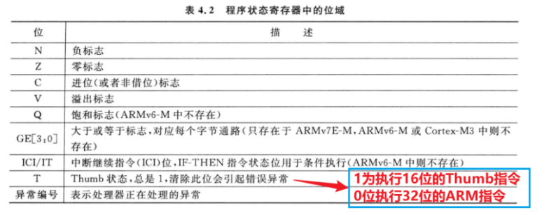 程序状态寄存器中有一位,名为“T”,它等于1时表示当前运行的是Thumb指令。