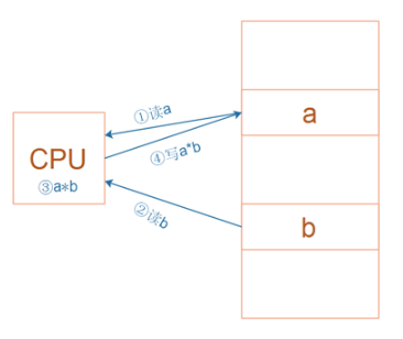 对于上图所示的乘法运算a = a * b,在RISC中要使用4条汇编指令: