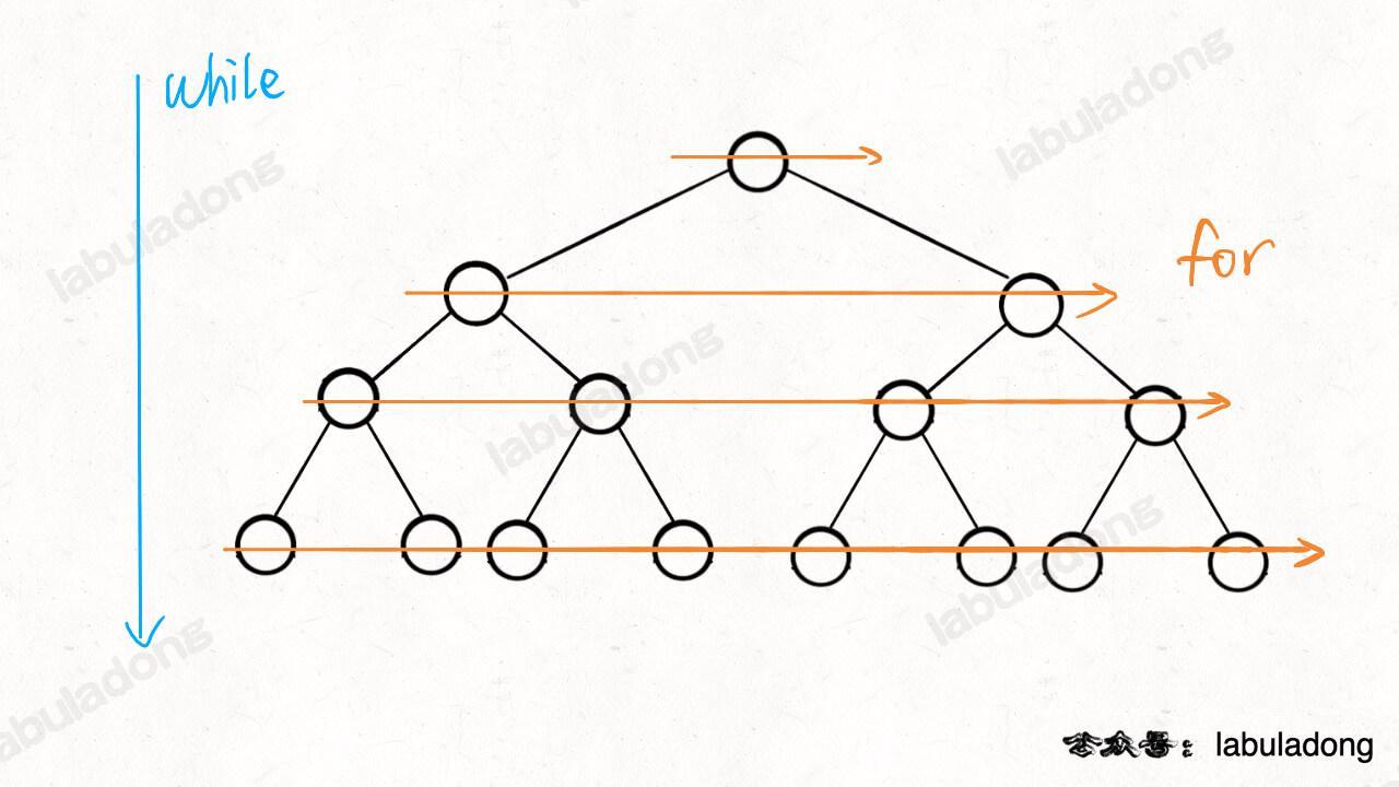 这里注意循环与的配合,循环控制一层一层往下走,循环利用变量从左到右遍历每一层二叉树节点: