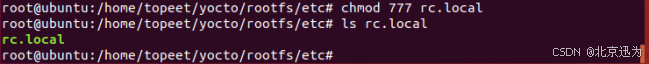 然后将“iTOP-STM32MP157开发板网盘资料汇总03_文件系统源码和镜像06_yocto文件系统06_rc.local”路径下的rc.local文件拷贝到文件系统的etc目录下,然后使用命令“sudo chmod 777 rc.local”修改文件对应的权限,如下图所示: