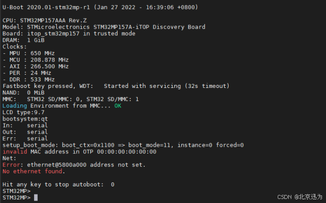 可以参考“第八章STM32MP157烧写系统”章节来进行镜像的烧写,烧写完成启动,在uboot倒计时的过程中点击任意键进入uboot命令行,如下图所示: