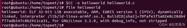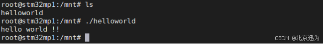 通过U盘或者其他方式将helloworld拷贝到开发板,然后使用命令“https://blog.csdn.net/BeiJingXunWei/article/details/helloworld”命令运行该程序,运行成功如下图所示: