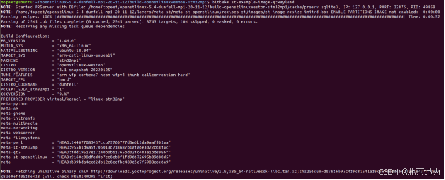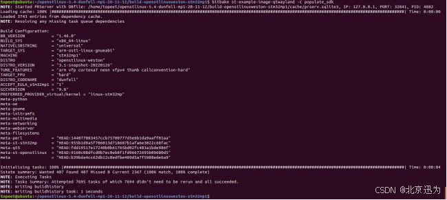 但我们还需要构建交叉编译工具链,所以我们还需要在当前路径下使用以下命令,编译完成如下图所示(注意该工具链编译可能会卡在某一个地方,造成编译失败,可以直接使用我们提供好的交叉编译工具链,存放路径为“iTOP-STM32MP157开发板网盘资料汇总03_文件系统源码和镜像06_yocto文件系统03_交叉编译器”):
