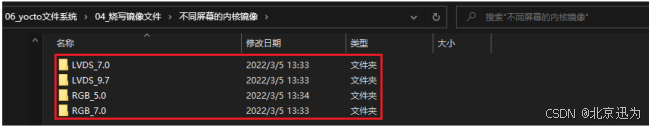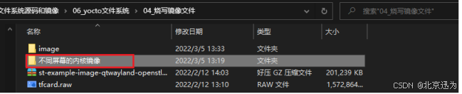 Yocto系统的镜像烧写和之前的QT系统存在区别,QT系统所使用的内核可以不用区分屏幕,而Yocto系统不同。所以我们在烧写镜像的时候需要修改对应的内核镜像,我们镜像存放路径为“iTOP-STM32MP157开发板网盘资料汇总03_文件系统源码和镜像06_yocto文件系统04_烧写镜像文件不同屏幕的内核镜像”,如下图所示: