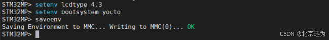 首先根据“8.7 设置屏幕参数”小节设置对应的屏幕参数,然后根据“8.8 设置系统启动参数”章节设置为yocto系统,在此使用4.3寸屏幕作为演示,具体命令如下图所示: