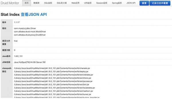 数据源:可以看到数据库连接池的配置信息及当前的使用情况