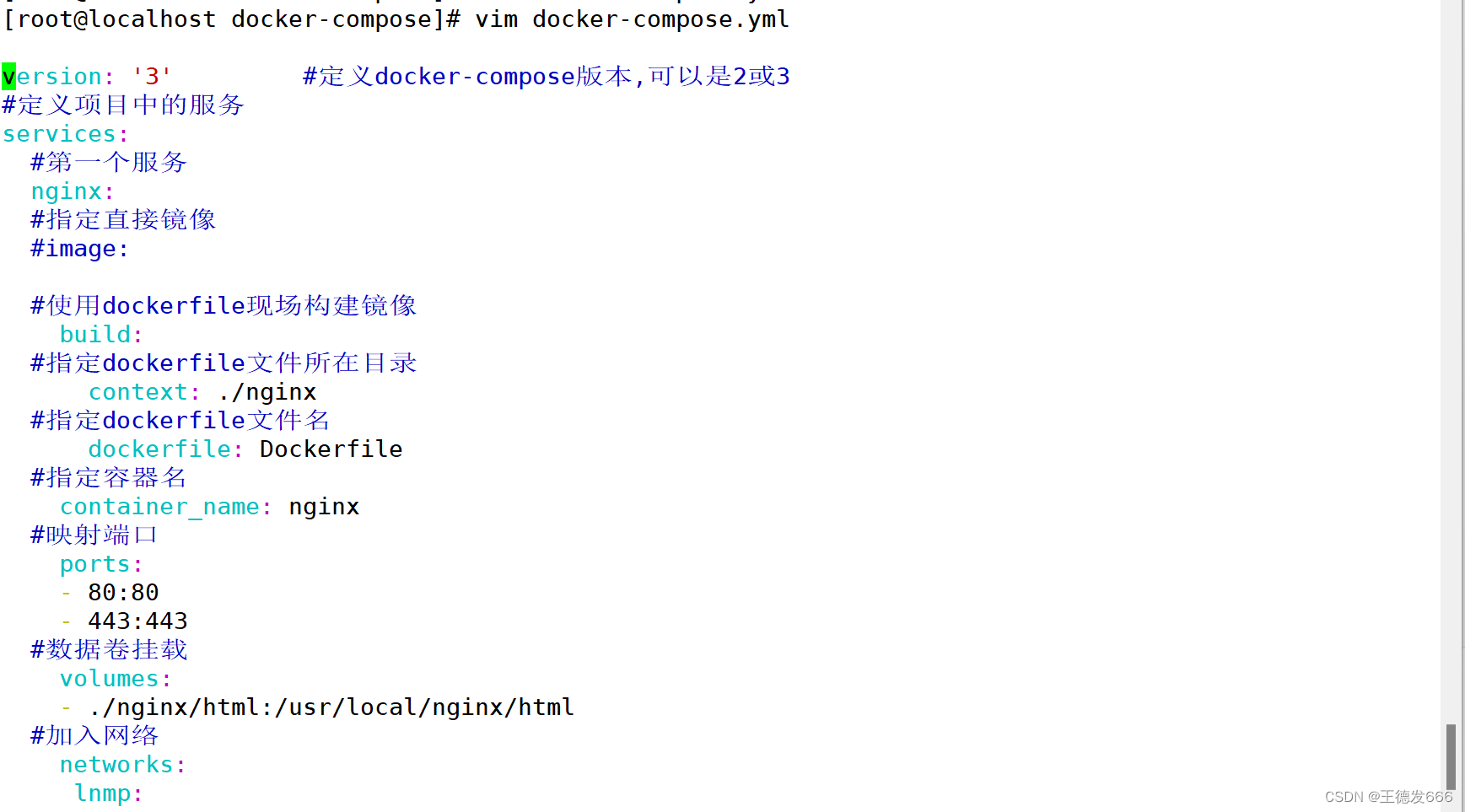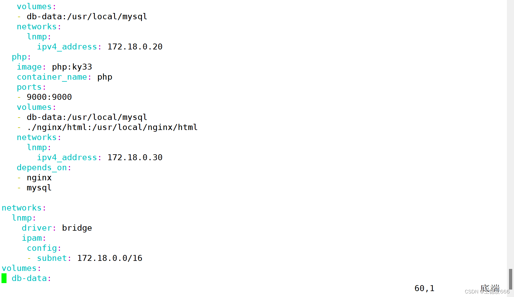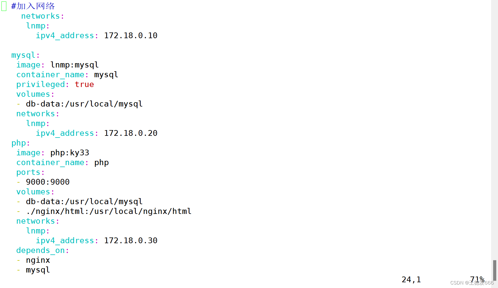 讯享网vim docker-compose.yml #使用dockerfile现场构建镜像 build: #指定dockerfile文件所在目录 context: https://blog.csdn.net/2301_76288258/article/details/nginx #指定dockerfile文件名 dockerfile: Dockerfile #指定容器名 container_name: nginx #映射端口 ports: - 80:80 - 443:443 #数据卷挂载 volumes: - https://blog.csdn.net/2301_76288258/article/details/nginx/html:/usr/local/nginx/html #加入网络 networks: lnmp: ipv4_address: 172.18.0.10 mysql: image: lnmp:mysql container_name: mysql privileged: true volumes: - db-data:/usr/local/mysql networks: lnmp: ipv4_address: 172.18.0.20 php: image: php:ky33 container_name: php ports: - 9000:9000 volumes: - db-data:/usr/local/mysql - https://blog.csdn.net/2301_76288258/article/details/nginx/html:/usr/local/nginx/html networks: lnmp: ipv4_address: 172.18.0.30 depends_on: - nginx - mysql networks: lnmp: driver: bridge ipam: config: - subnet: 172.18.0.0/16 volumes: db-data:
