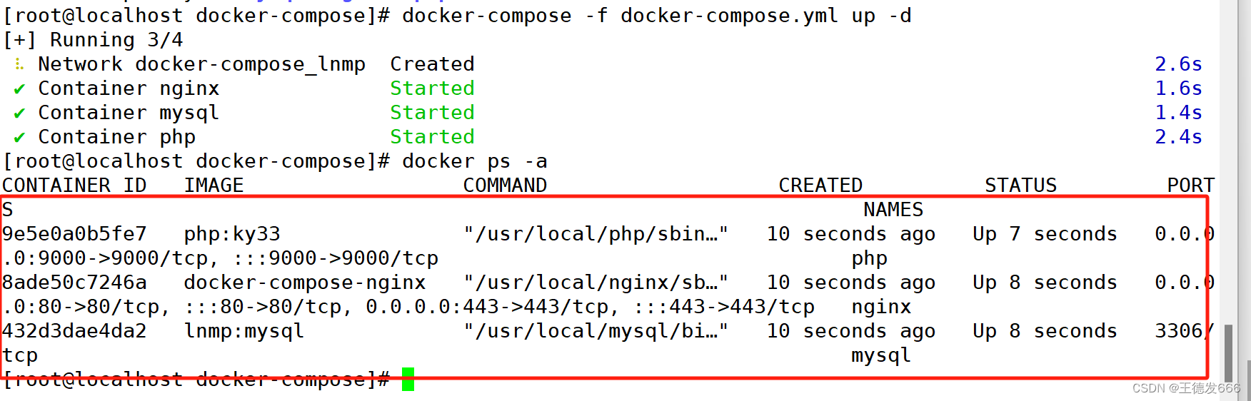 docker-compose -f docker-compose.yml up -d [+] Running 3⁄4 ⠧ Network docker-compose_lnmp Created 2.6s ✔ Container nginx Started 1.6s ✔ Container mysql Started 1.4s ✔ Container php Started 2.4s docker ps -a CONTAINER ID IMAGE COMMAND CREATED STATUS PORTS NAMES 9e5e0a0b5fe7 php:ky33 “/usr/local/php/sbin…” 10 seconds ago Up 7 seconds 0.0.0.0:9000->9000/tcp, :::9000->9000/tcp php 8ade50c7246a docker-compose-nginx “/usr/local/nginx/sb…” 10 seconds ago Up 8 seconds 0.0.0.0:80->80/tcp, :::80->80/tcp, 0.0.0.0:443->443/tcp, :::443->443/tcp nginx 432d3dae4da2 lnmp:mysql “/usr/local/mysql/bi…” 10 seconds ago Up 8 seconds 3306/tcp mysql