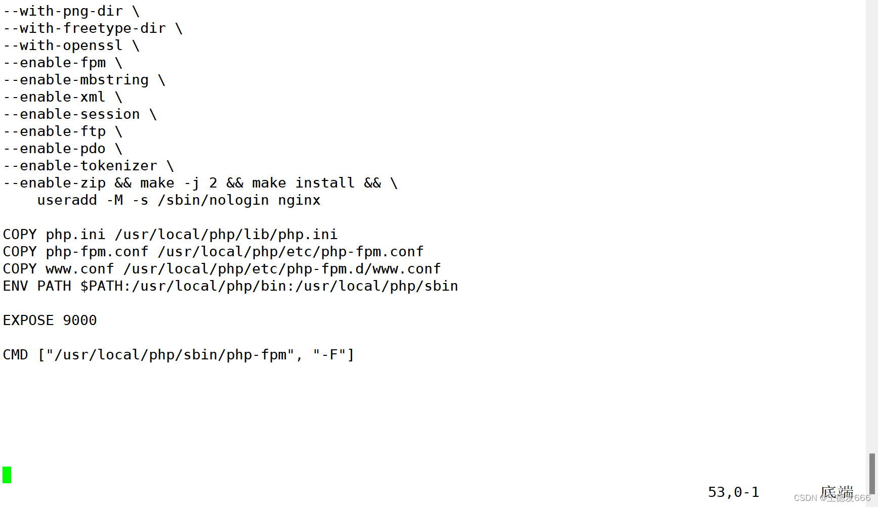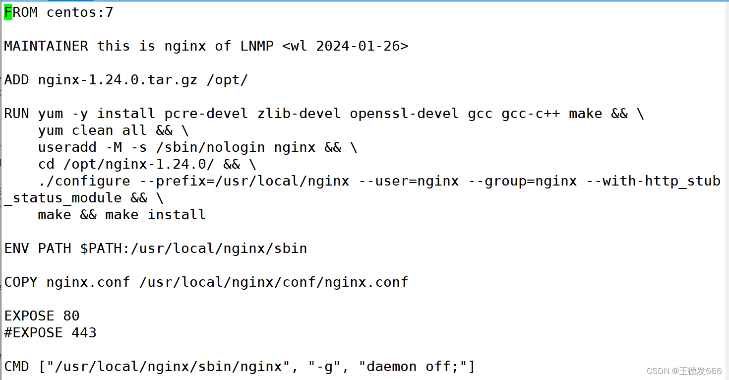 讯享网ROM centos:7 MAINTAINER this is nginx of LNMP <wl 2024-01-26> ADD nginx-1.24.0.tar.gz /opt/ RUN yum -y install pcre-devel zlib-devel openssl-devel gcc gcc-c++ make && yum clean all && useradd -M -s /sbin/nologin nginx && cd /opt/nginx-1.24.0/ && https://blog.csdn.net/2301_/article/details/configure –prefix=/usr/local/nginx –user=nginx –group=nginx –with-http_stub_status_module && make && make install ENV PATH $PATH:/usr/local/nginx/sbin COPY nginx.conf /usr/local/nginx/conf/nginx.conf EXPOSE 80 #EXPOSE 443 CMD [“/usr/local/nginx/sbin/nginx”, “-g”, “daemon off;”]