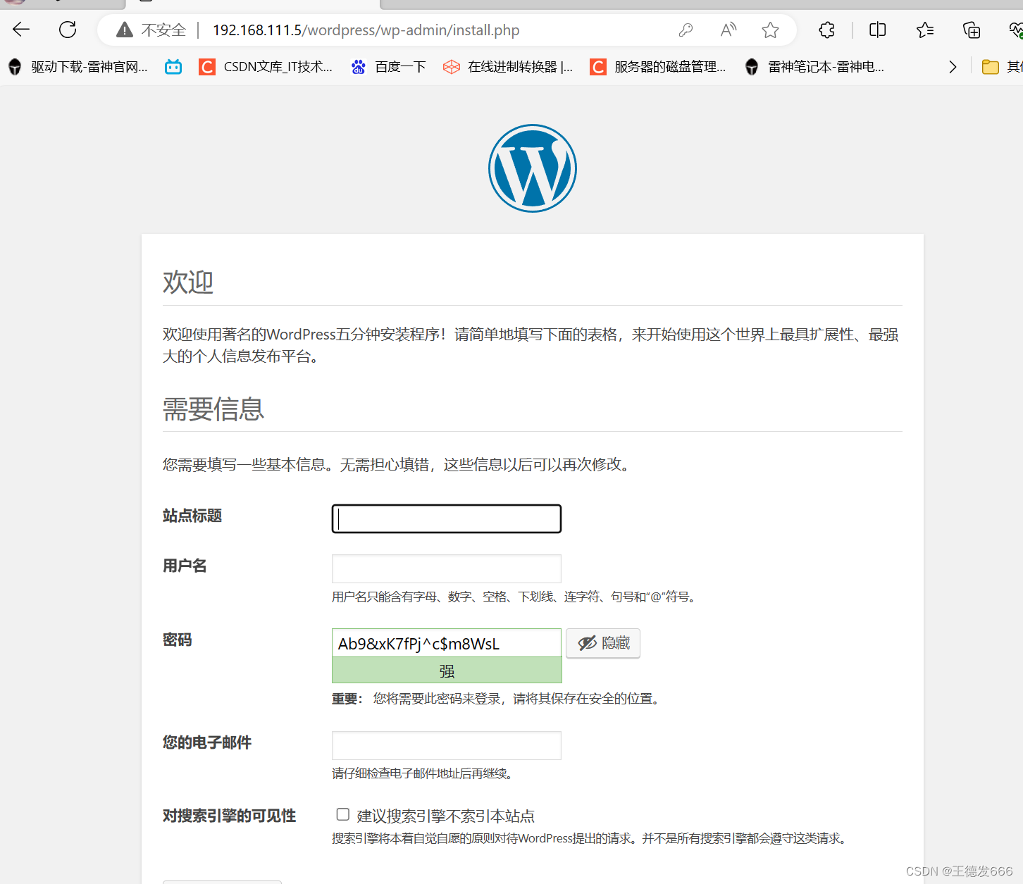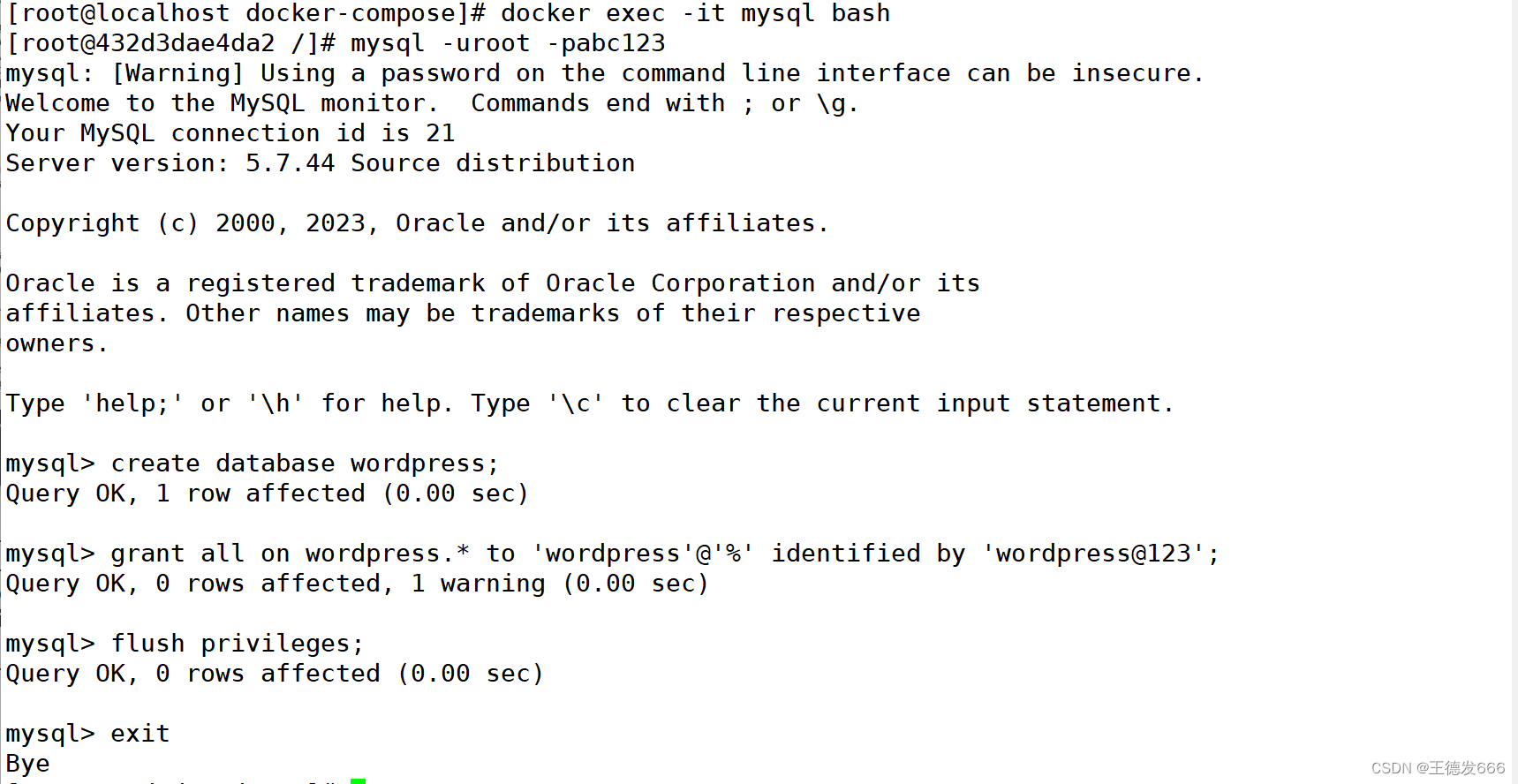 讯享网docker exec -it mysql bash mysqladmin -u root -p password “abc123” Enter password: mysqladmin: [Warning] Using a password on the command line interface can be insecure. Warning: Since password will be sent to server in plain text, use ssl connection to ensure password safety. mysql -uroot -pabc123 mysql: [Warning] Using a password on the command line interface can be insecure. Welcome to the MySQL monitor. Commands end with ; or g. Your MySQL connection id is 10 Server version: 5.7.44 Source distribution Copyright © 2000, 2023, Oracle and/or its affiliates. Oracle is a registered trademark of Oracle Corporation and/or its affiliates. Other names may be trademarks of their respective owners. Type ‘help;’ or ‘h’ for help. Type ‘c’ to clear the current input statement. mysql> create database wordpress; Query OK, 1 row affected (0.00 sec) mysql>grant all on wordpress.* to ‘wordpress’@‘%’ identified by ‘wordpress@123’; Query OK, 0 rows affected, 1 warning (0.01 sec) mysql> flush privileges; Query OK, 0 rows affected (0.00 sec) mysql> exit Bye