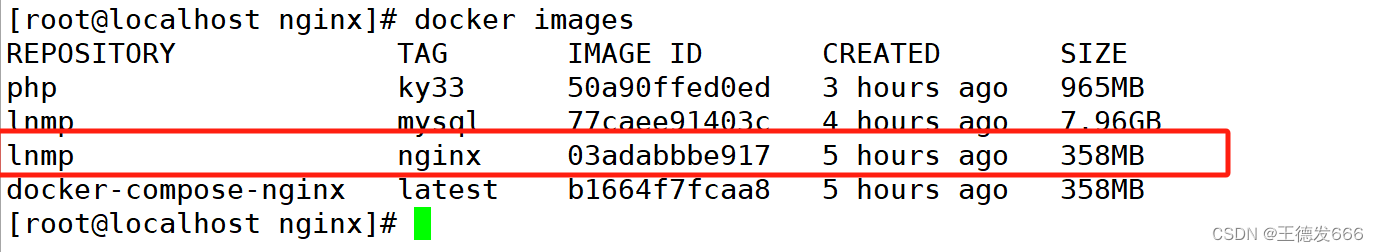 docker images REPOSITORY TAG IMAGE ID CREATED SIZE lnmp nginx 03adabbbe917 5 hours ago 358MB