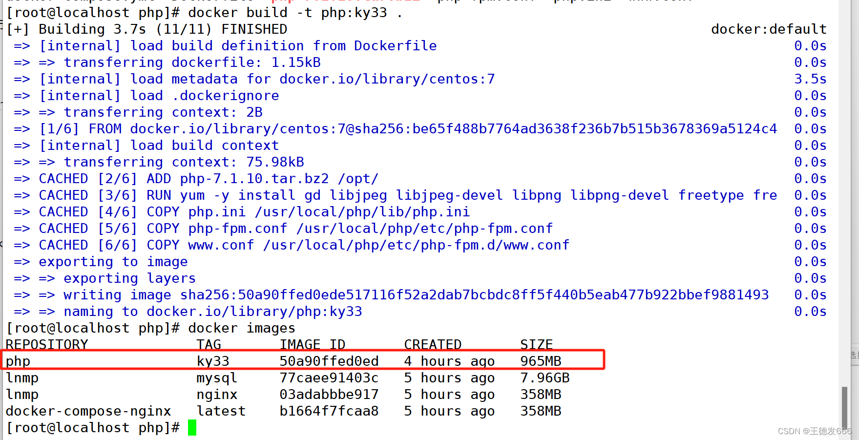 讯享网docker build -t php:ky33 . [+] Building 3.7s (11⁄11) FINISHED docker:default => [internal] load build definition from Dockerfile 0.0s => => transferring dockerfile: 1.15kB 0.0s => [internal] load metadata for docker.io/library/centos:7 3.5s => [internal] load .dockerignore 0.0s => => transferring context: 2B 0.0s => [1⁄6] FROM docker.io/library/centos:7@sha256:be65f488b7764ad3638f236b7b515ba5124c4 0.0s => [internal] load build context 0.0s => => transferring context: 75.98kB 0.0s => CACHED [2⁄6] ADD php-7.1.10.tar.bz2 /opt/ 0.0s => CACHED [3⁄6] RUN yum -y install gd libjpeg libjpeg-devel libpng libpng-devel freetype fre 0.0s => CACHED [4⁄6] COPY php.ini /usr/local/php/lib/php.ini 0.0s => CACHED [5⁄6] COPY php-fpm.conf /usr/local/php/etc/php-fpm.conf 0.0s => CACHED [6⁄6] COPY www.conf /usr/local/php/etc/php-fpm.d/www.conf 0.0s => exporting to image 0.0s => => exporting layers 0.0s => => writing image sha256:50a90ffed0edef52a2dab7bcbdc8ff5f440b5eab477b922bbef 0.0s => => naming to docker.io/library/php:ky33 0.0s docker images REPOSITORY TAG IMAGE ID CREATED SIZE php ky33 50a90ffed0ed 4 hours ago 965MB lnmp mysql 77caee91403c 5 hours ago 7.96GB lnmp nginx 03adabbbe917 5 hours ago 358MB docker-compose-nginx latest b1664f7fcaa8 5 hours ago 358MB