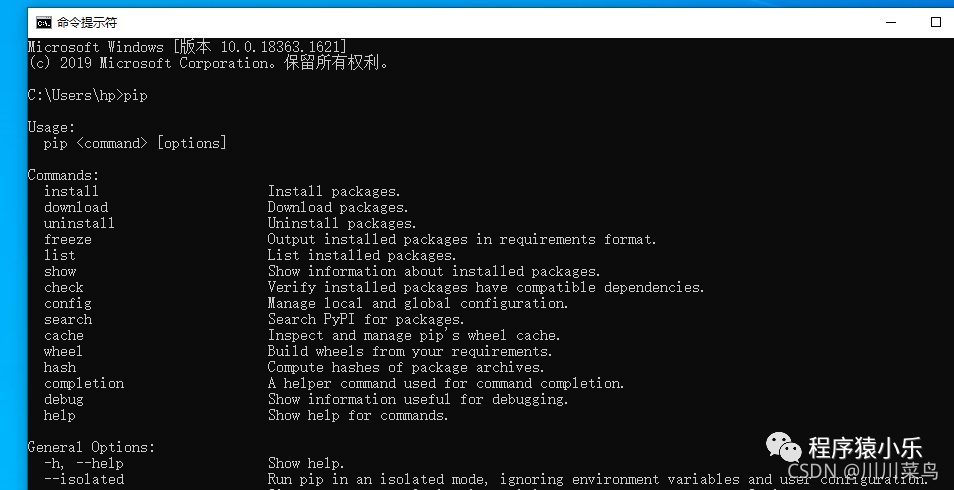 退出pycharm,因为加了环境变量需要重启软件。我们先到cmd输入pip,如下就是配置成功了: