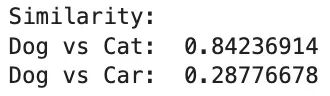 cat = model.wv[‘cat’]car = model.wv[‘car’]dogvscat = model.wv.similarity(‘dog’,‘cat’)dogvscar = model.wv.similarity(‘dog’,‘car’)print(“Similarity:”)print(“Dog vs Cat: “, dogvscat)print(“Dog vs Car: “, dogvscar)