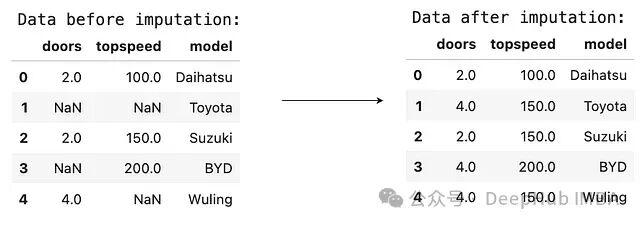 data = pd.DataFrame({ ‘doors’: [2, np.nan, 2, np.nan, 4], ‘topspeed’: [100, np.nan, 150, 200, np.nan], ‘model’: [‘Daihatsu’, ‘Toyota’, ‘Suzuki’, ‘BYD’,‘Wuling’] })