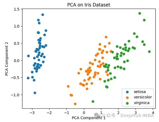 for point in set(targets): plt.scatter(pca_features[targets == point, 0], pca_features[targets == point,1], label=iris_data.target_names[point]) plt.xlabel(‘PCA Component 1’) plt.ylabel(‘PCA Component 2’) plt.title(‘PCA on Iris Dataset’) plt.legend() plt.show()