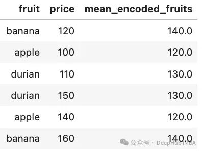fruits = [‘banana’,‘apple’,‘durian’,‘durian’,‘apple’,‘banana’] price = [120,100,110,150,140,160] data = pd.DataFrame({ ‘fruit’: fruits, ‘price’: price }) data[‘encoded_fruits’] = data.groupby(‘fruit’)[‘price’].transform(‘mean’) data