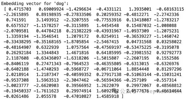 corpus = api.load(‘text8’)model = Word2Vec(corpus)dog = model.wv[‘dog’]print(“Embedding vector for ‘dog’:\n”, dog)